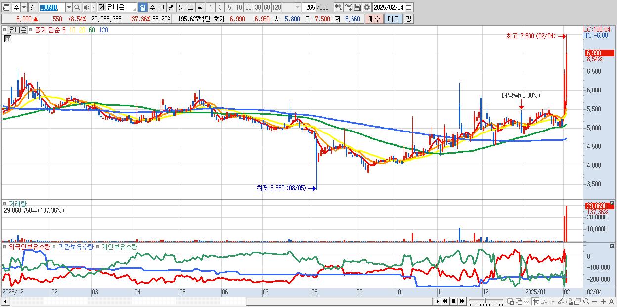 - 유니온 (6,990원 ▲ 8.54% , 시총: 1,091억, 거래량: 29,068,758, 거래대금:1,956억, KOSPI)
