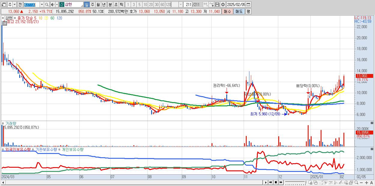 - 삼현 (13,060원 ▲ 19.71% , 시총: 4,141억, 거래량: 15,895,292, 거래대금:2,006억)
