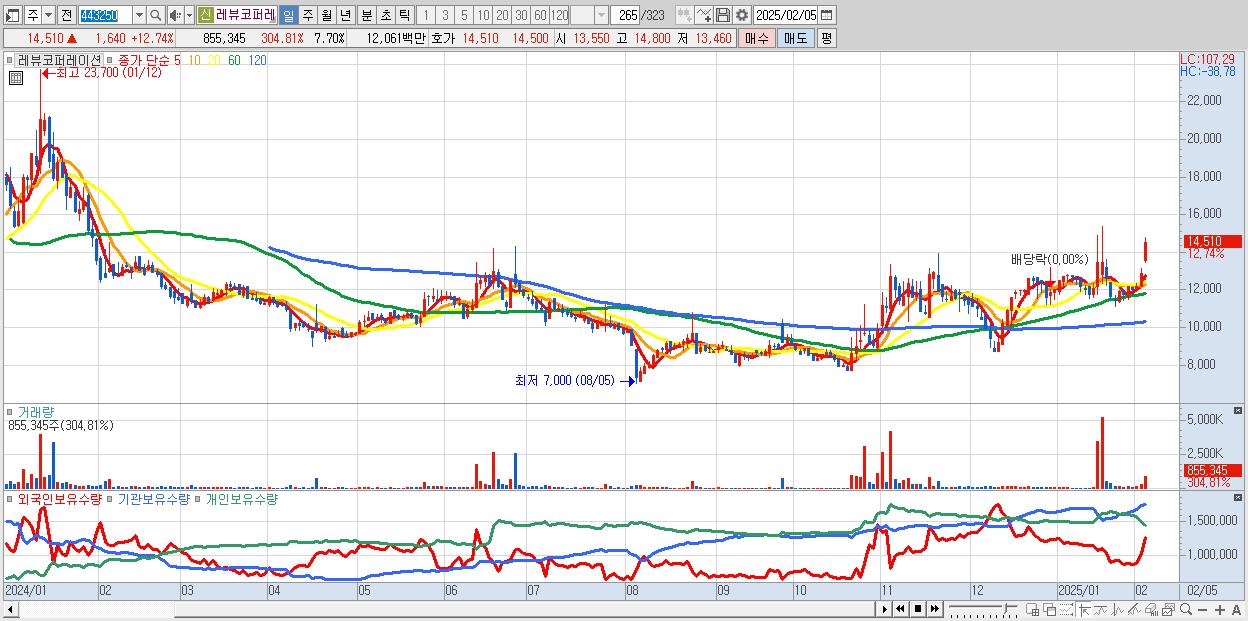 - 레뷰코퍼레이션 (14,510원 ▲ 12.74% , 시총: 1,612억, 거래량: 855,345, 거래대금:121억)