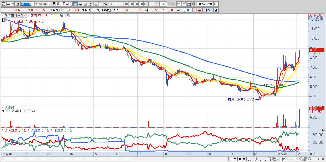 - 에스피시스템스 (8,820원 ▲ 12.07% , 시총: 950억, 거래량: 9,659,622, 거래대금:891억)