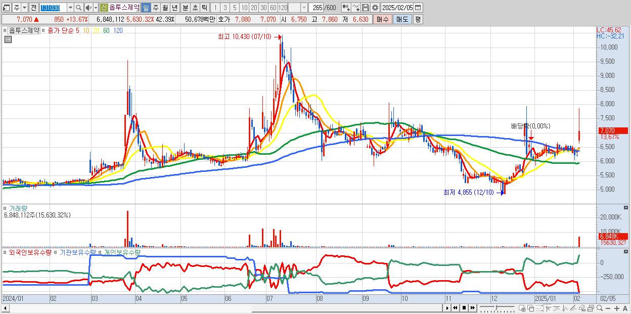 - 옵투스제약 (7,070원 ▲ 13.67% , 시총: 1,142억, 거래량: 6,848,112, 거래대금:507억)