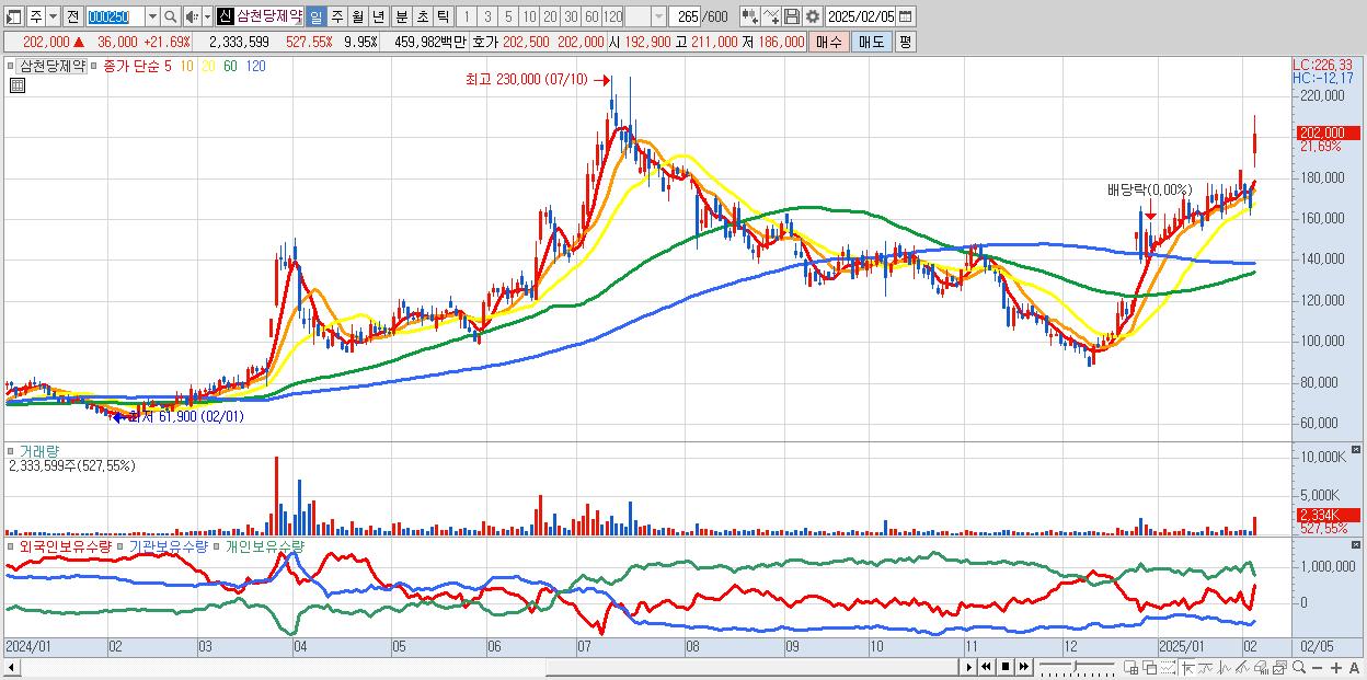 - 삼천당제약 (202,000원 ▲ 21.69% , 시총: 47,384억, 거래량: 2,333,599, 거래대금:4,600억)