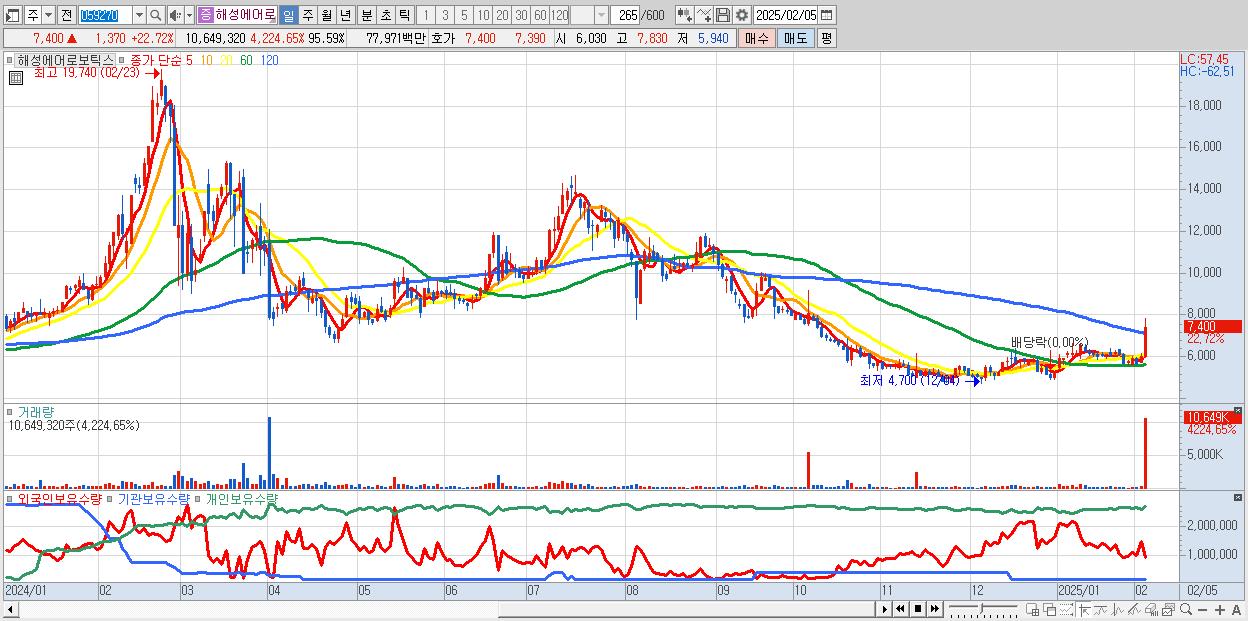 - 해성에어로보틱스 (7,400원 ▲ 22.72% , 시총: 824억, 거래량: 10,649,320, 거래대금:780억)