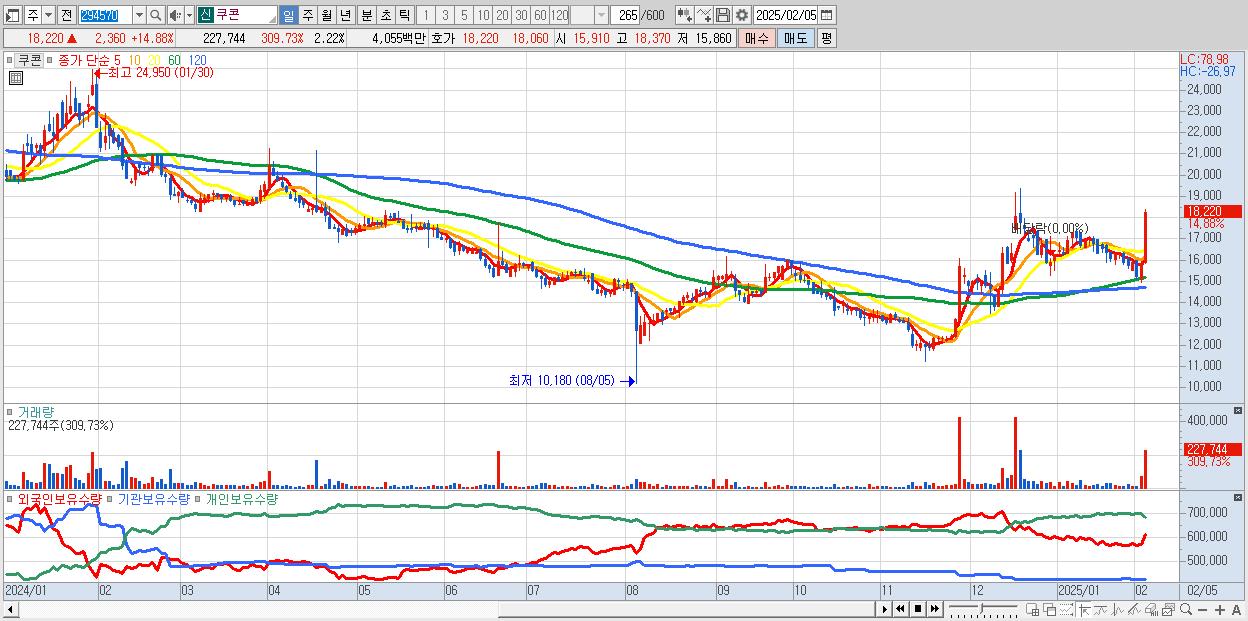 - 쿠콘 (18,220원 ▲ 14.88% , 시총: 1,868억, 거래량: 227,744, 거래대금:41억)