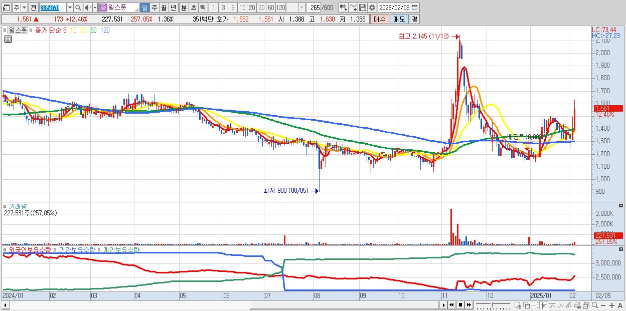 - 윙스풋 (1,561원 ▲ 12.46% , 시총: 260억, 거래량: 227,531, 거래대금:4억)