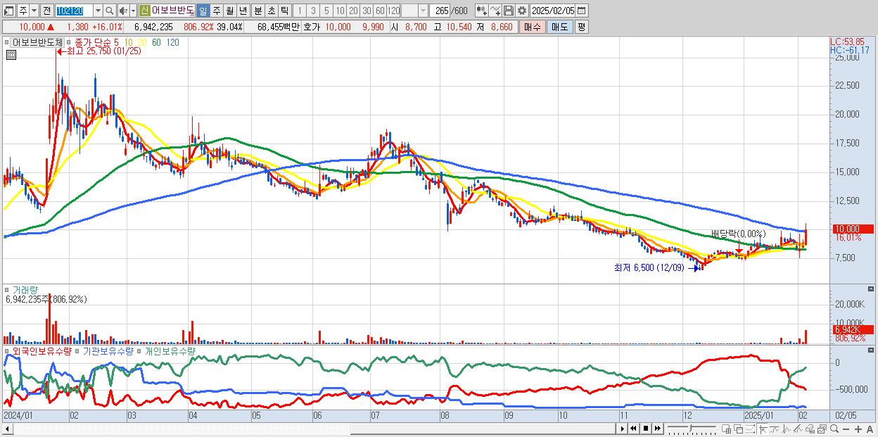 - 어보브반도체 (10,000원 ▲ 16.01% , 시총: 1,778억, 거래량: 6,942,235, 거래대금:685억)