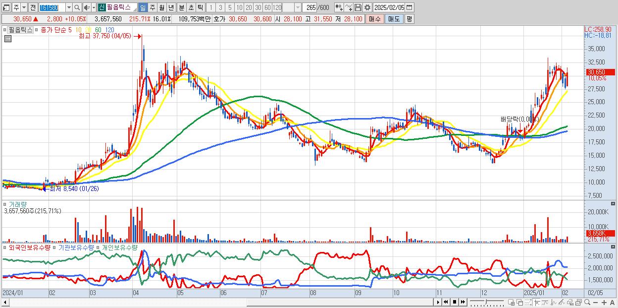 - 필옵틱스 (30,650원 ▲ 10.05% , 시총: 7,004억, 거래량: 3,657,560, 거래대금:1,098억)
