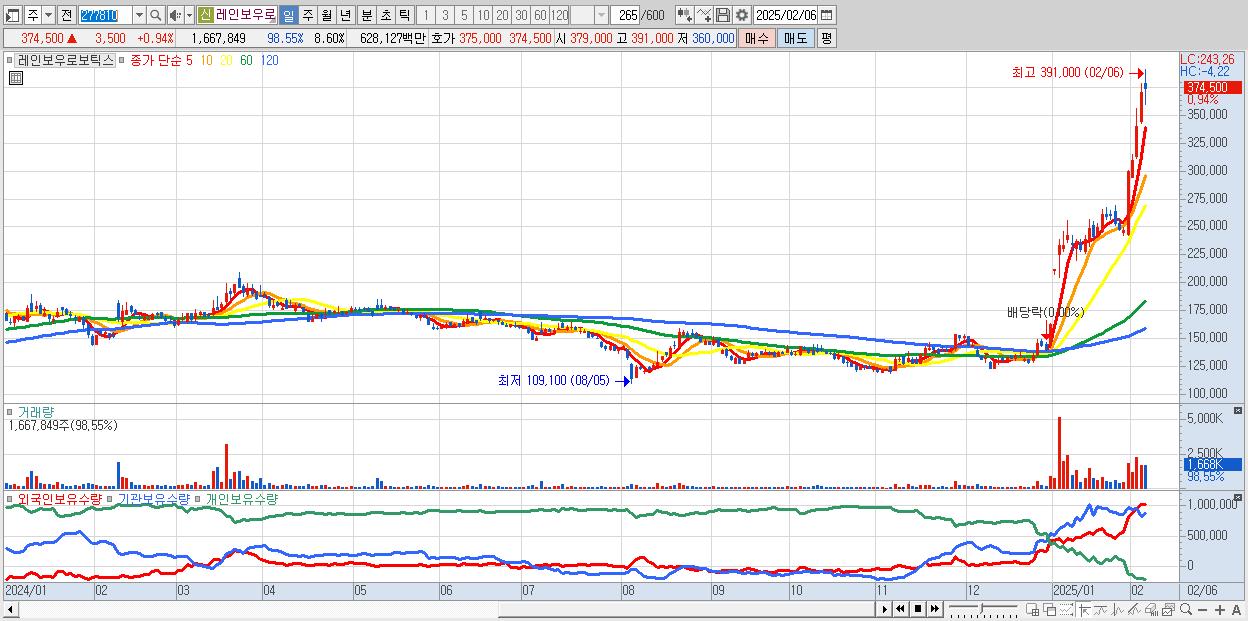 - 레인보우로보틱스 (374,500원 ▲ 0.94% , 시총: 72,652억, 거래량: 1,667,849, 거래대금:6,281억)