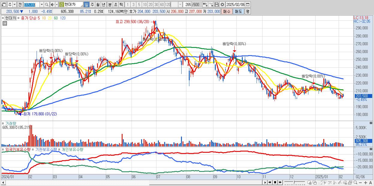 - 현대차 (203,500원 ▼ -0.49% , 시총: 426,162억, 거래량: 605,308, 거래대금:1,242억)