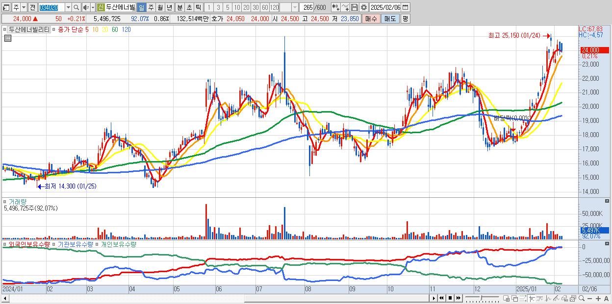 - 두산에너빌리티 (24,000원 ▲ 0.21% , 시총: 153,735억, 거래량: 5,496,725, 거래대금:1,325억)
