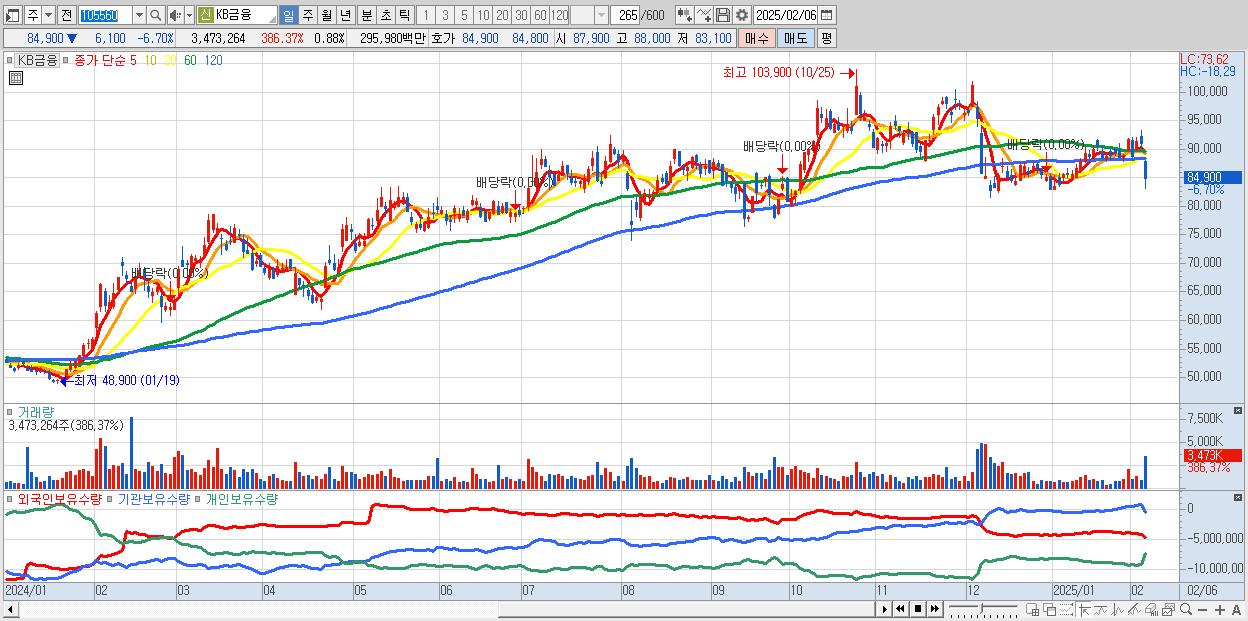 - KB금융 (84,900원 ▼ -6.7% , 시총: 334,106억, 거래량: 3,473,264, 거래대금:2,960억)