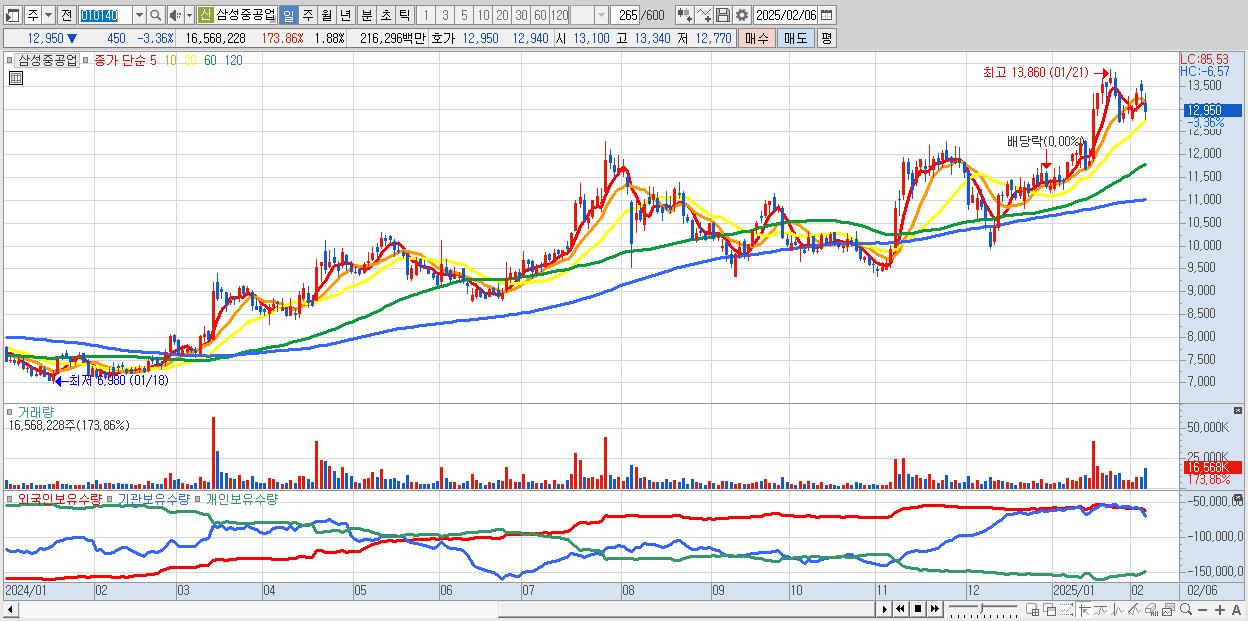 - 삼성중공업 (12,950원 ▼ -3.36% , 시총: 113,960억, 거래량: 16,568,228, 거래대금:2,163억)