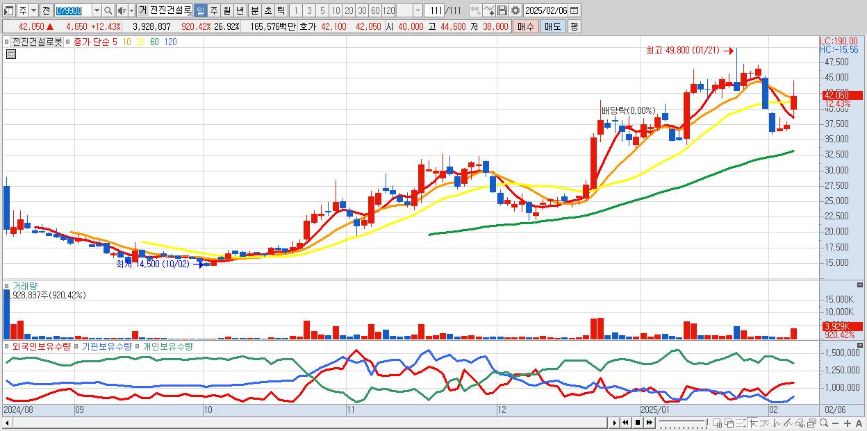- 전진건설로봇 (42,050원 ▲ 12.43% , 시총: 6,136억, 거래량: 3,928,837, 거래대금:1,656억)