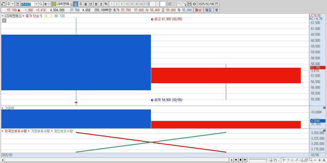 - LG씨엔에스 (57,700원 ▲ 3.41% , 시총: 55,903억, 거래량: 4,504,009, 거래대금:2,551억)