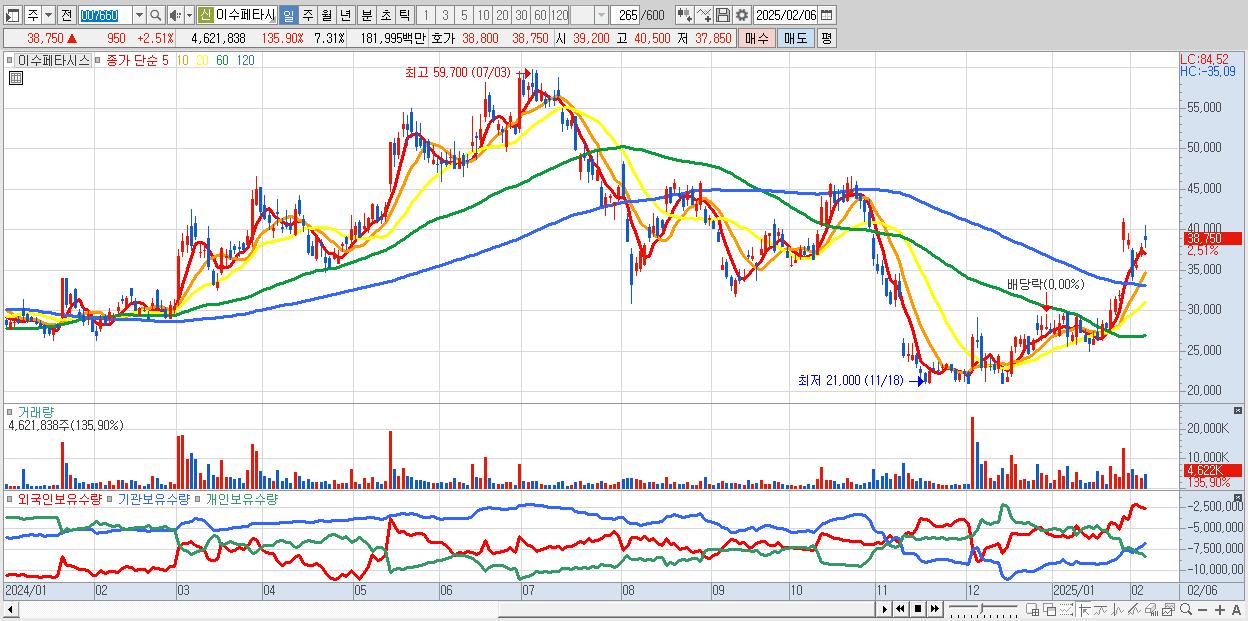 - 이수페타시스 (38,750원 ▲ 2.51% , 시총: 24,508억, 거래량: 4,621,838, 거래대금:1,820억)