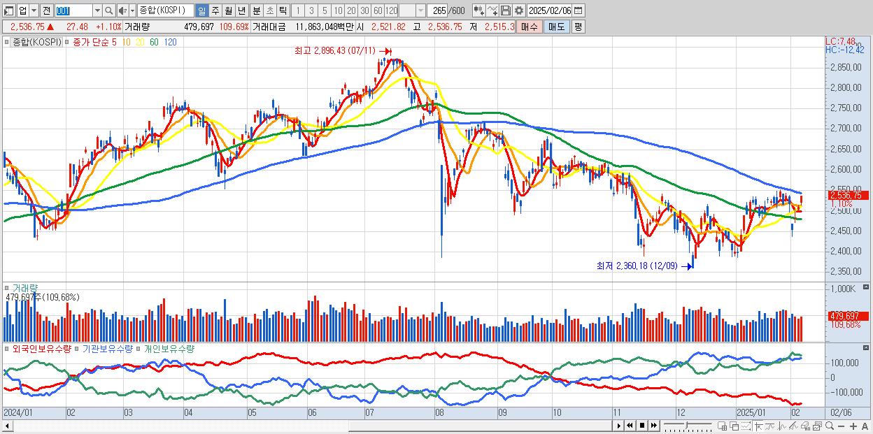 | 02/06 | 2,536.75 | ▲1.10% | -6,060억 | 3,516억 | 1,612억 | 932억 |