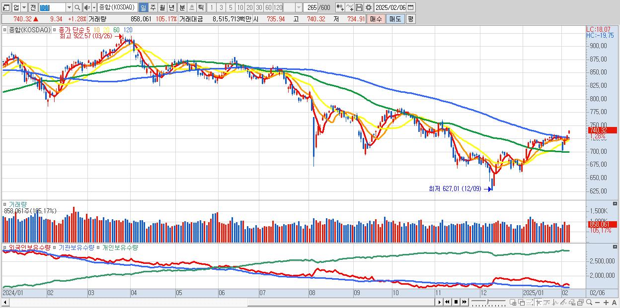 | 02/06 | 740.32 | ▲1.28% | -661억 | 74억 | 675억 | -89억 |