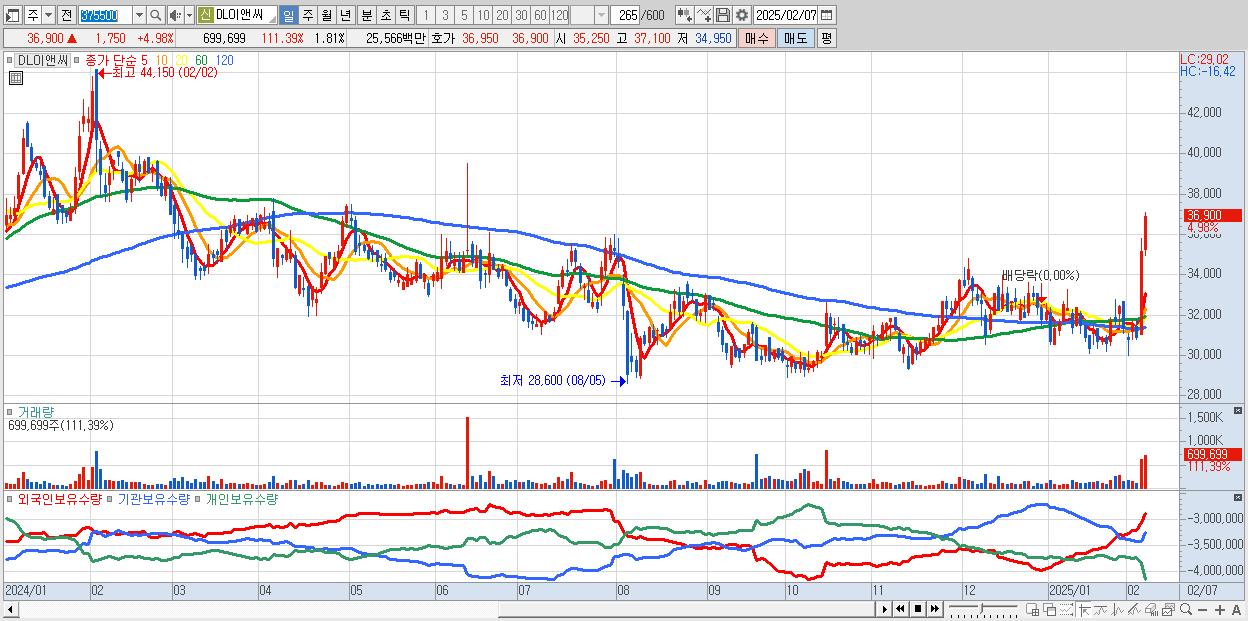 - DL이앤씨 (36,900원 ▲ 4.98% , 시총: 14,278억, 외국인 순매수 거래금:58억)