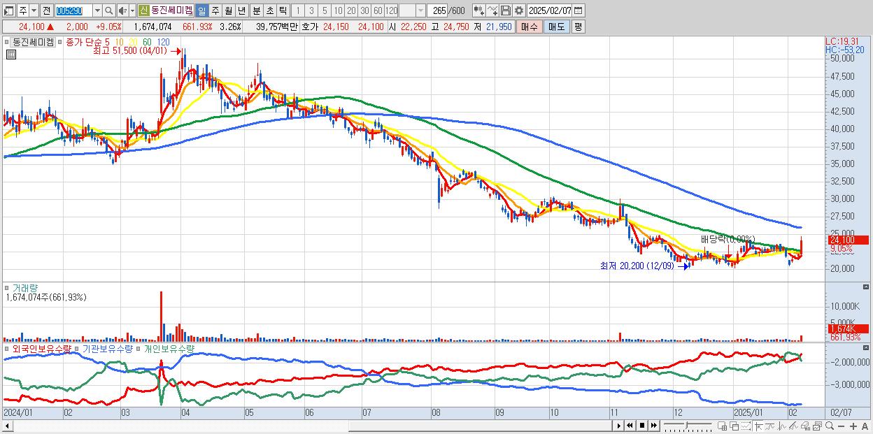 - 동진쎄미켐 (24,100원 ▲ 9.05% , 시총: 12,391억, 외국인 순매수 거래금:49억)
