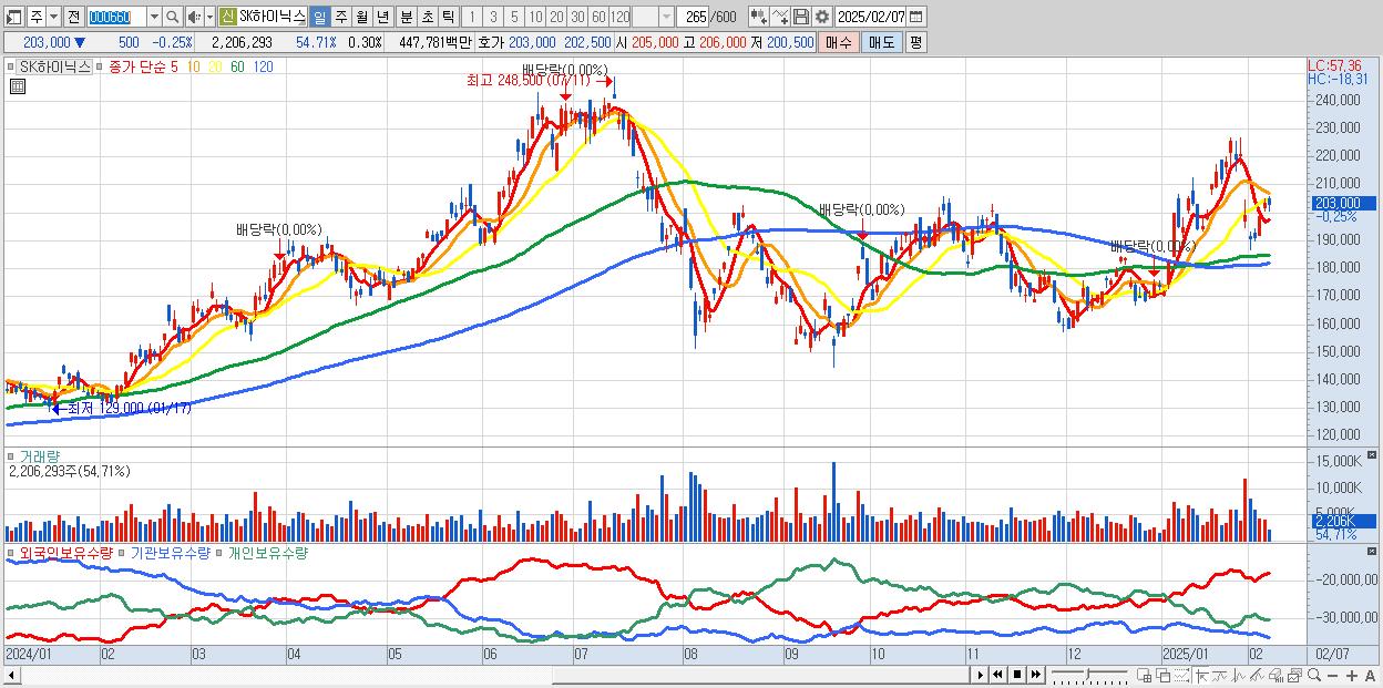 - SK하이닉스 (203,000원 ▼ -0.25% , 시총: 1,477,845억, 외국인 순매수 거래금:738억)