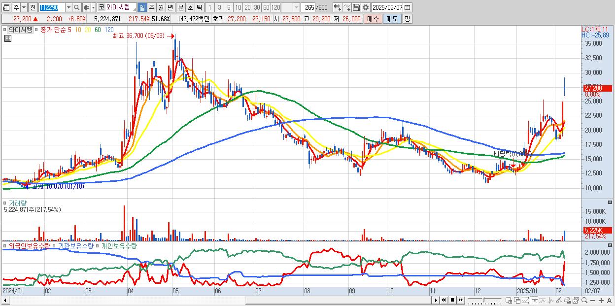 - 와이씨켐 (27,200원 ▲ 8.8% , 시총: 2,750억, 외국인 순매수 거래금:73억)