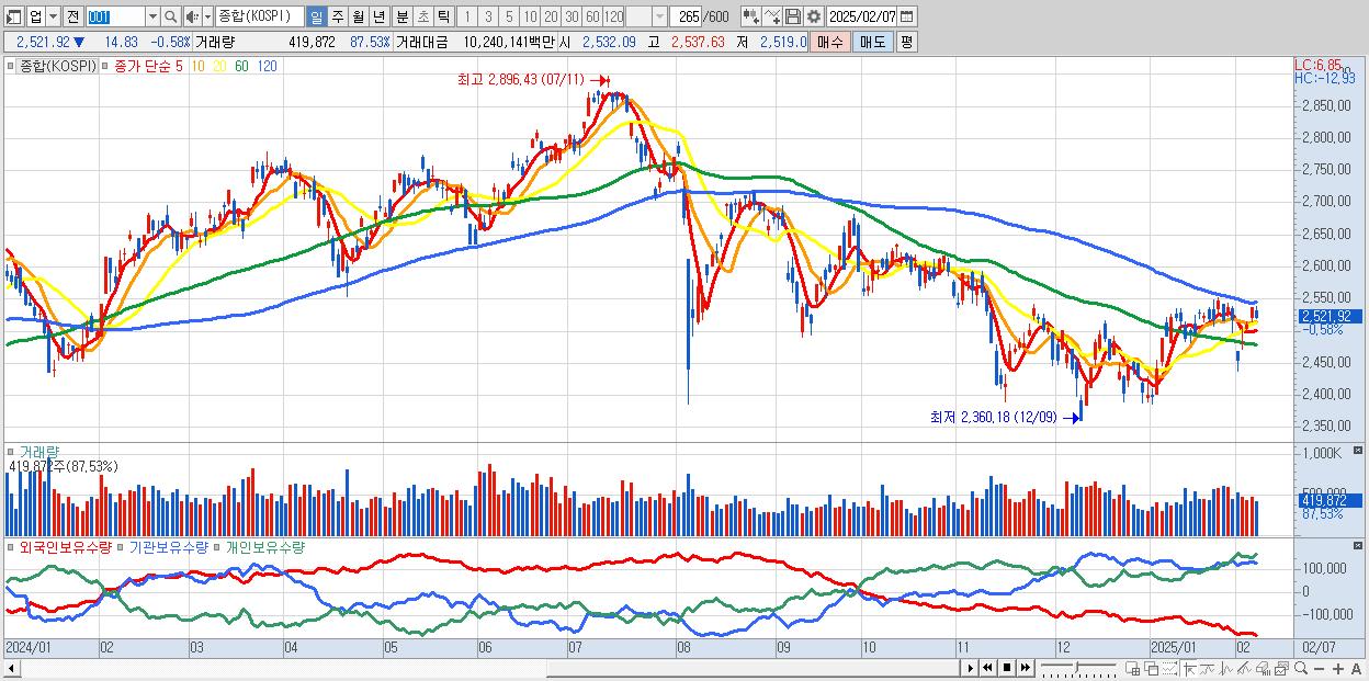 | 02/07 | 2,521.92 | ▼-0.58% | 3,302억 | -2,389억 | -2,099억 | 1,186억 |