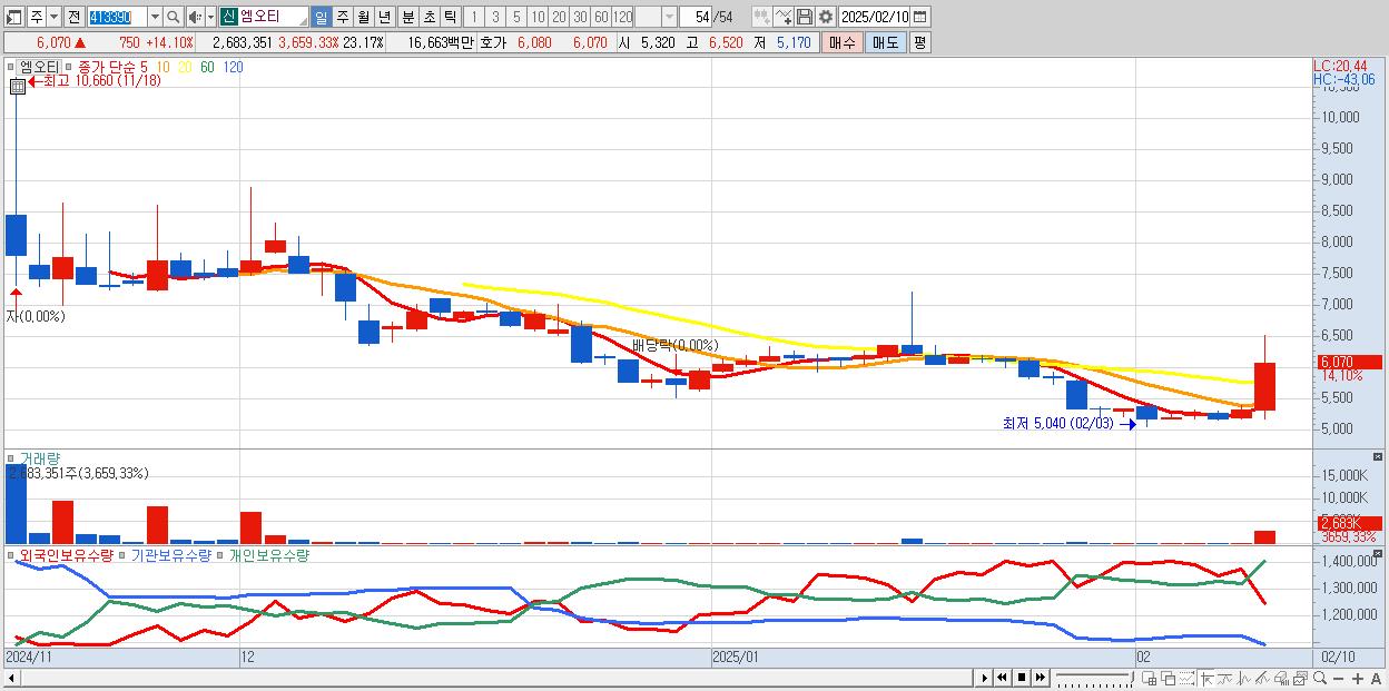 - 엠오티 (6,070원 ▲ 14.1% , 시총: 703억, 거래량: 2,683,351, 거래대금:167억)