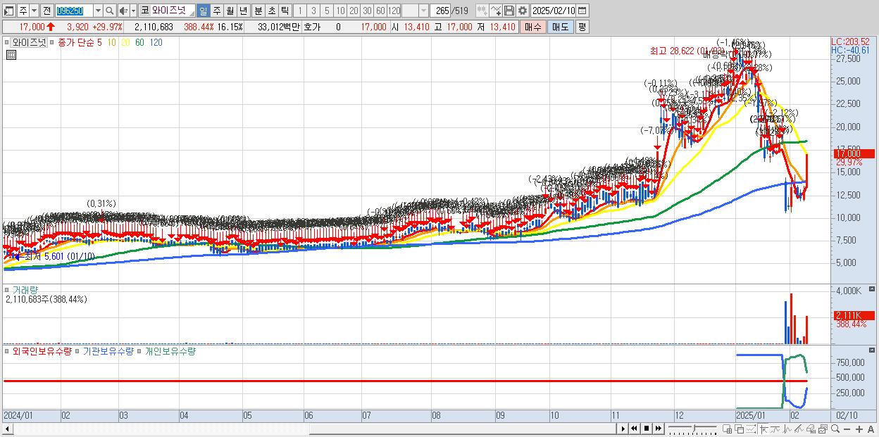 - 와이즈넛 (17,000원 ▲ 29.97% , 시총: 2,221억, 거래량: 2,110,683, 거래대금:330억)