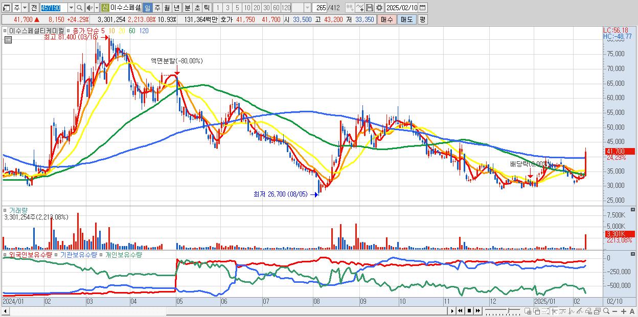 - 이수스페셜티케미컬 (41,700원 ▲ 24.29% , 시총: 12,597억, 거래량: 3,301,254, 거래대금:1,314억)
