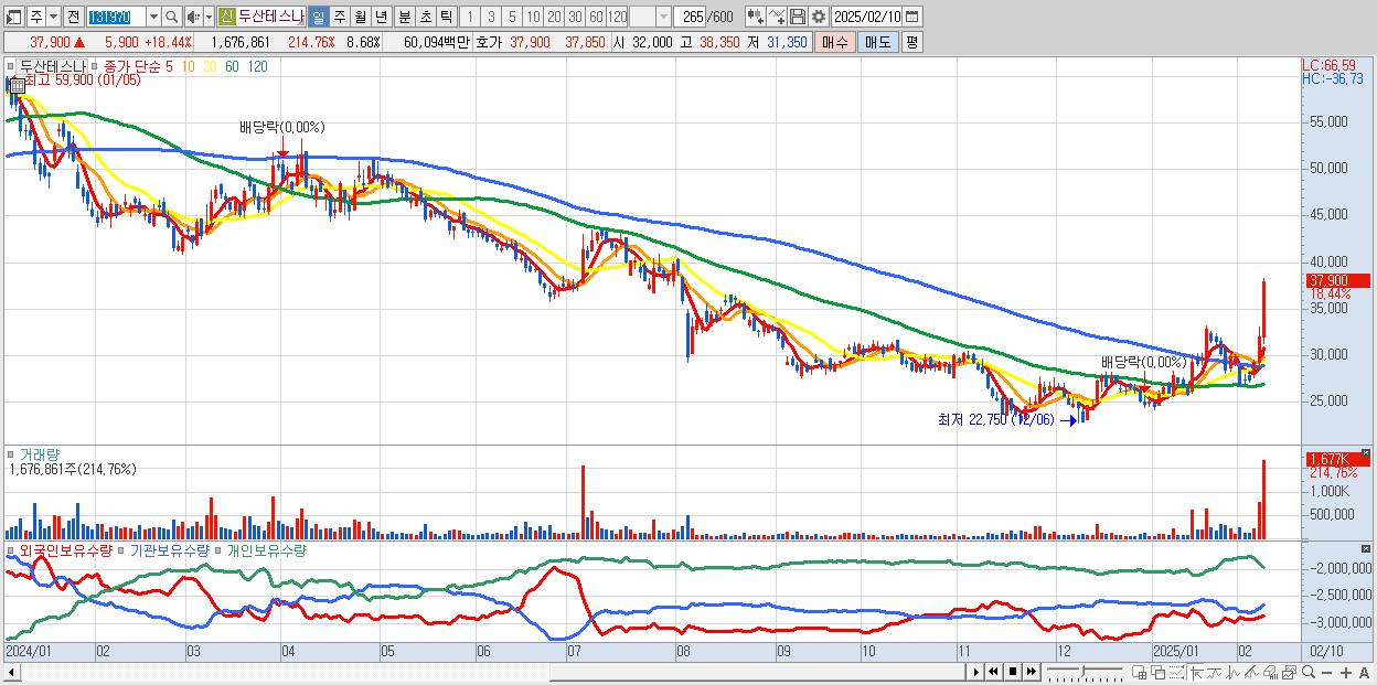- 두산테스나 (37,900원 ▲ 18.44% , 시총: 7,325억, 거래량: 1,676,861, 거래대금:601억)