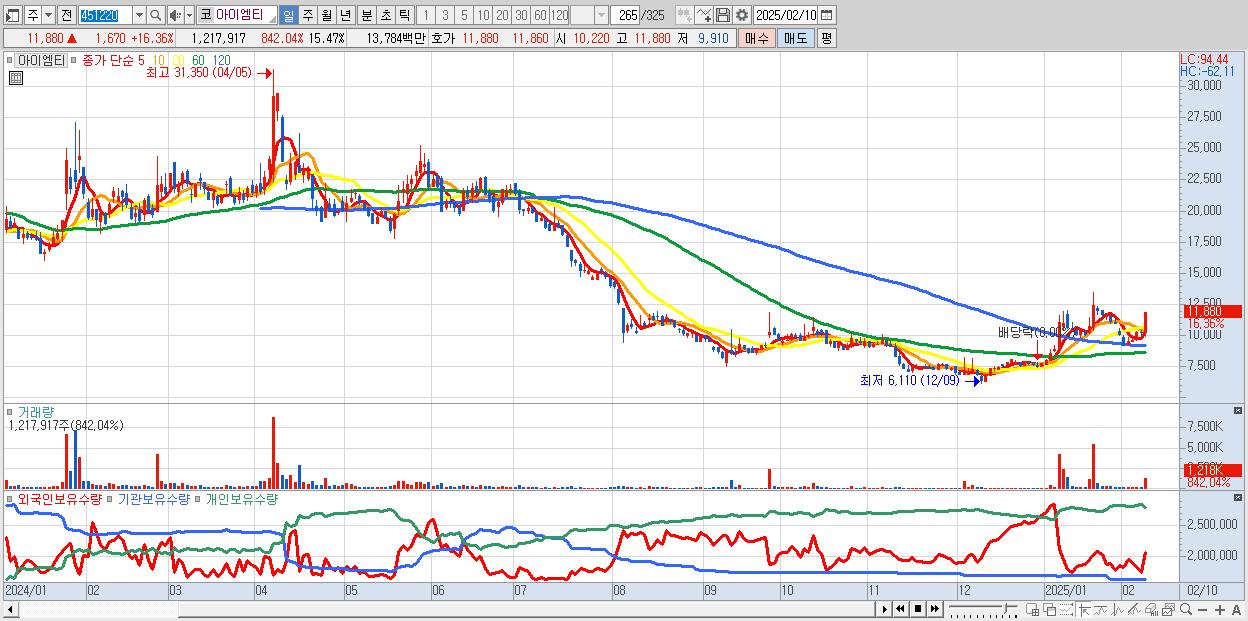 - 아이엠티 (11,880원 ▲ 16.36% , 시총: 936억, 거래량: 1,217,917, 거래대금:138억)