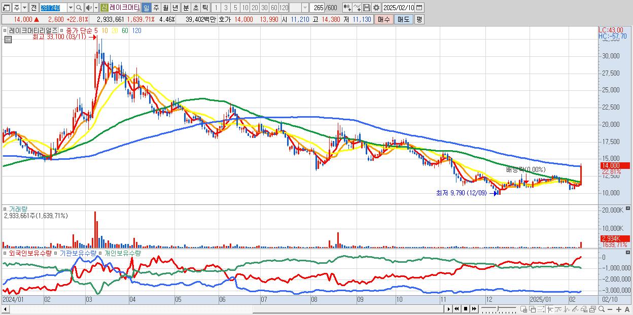 - 레이크머티리얼즈 (14,000원 ▲ 22.81% , 시총: 9,202억, 거래량: 2,933,661, 거래대금:394억)