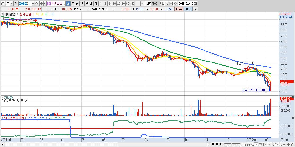 - 케이알엠 (3,380원 ▲ 30% , 시총: 1,102억, 거래량: 900,233, 거래대금:29억)