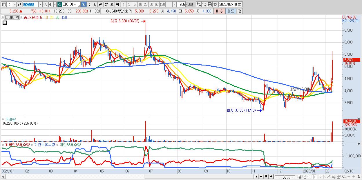 - 디아이씨 (5,280원 ▲ 16.81% , 시총: 2,053억, 거래량: 16,295,105, 거래대금:846억)