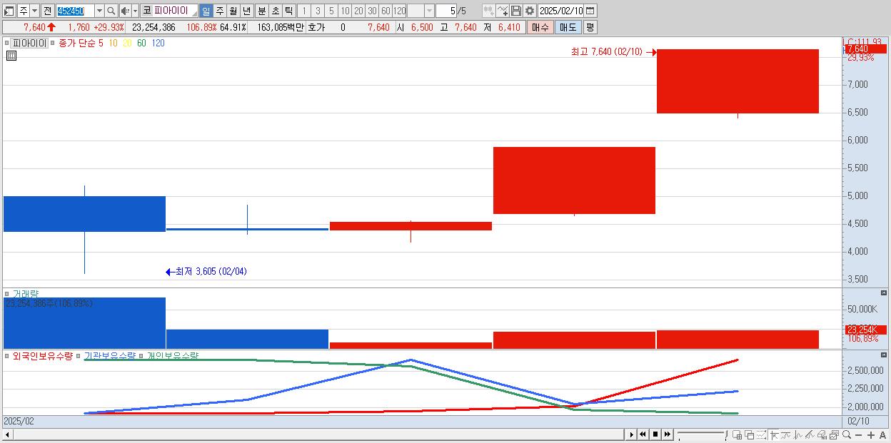 - 피아이이 (7,640원 ▲ 29.93% , 시총: 2,737억, 거래량: 23,254,386, 거래대금:1,631억)