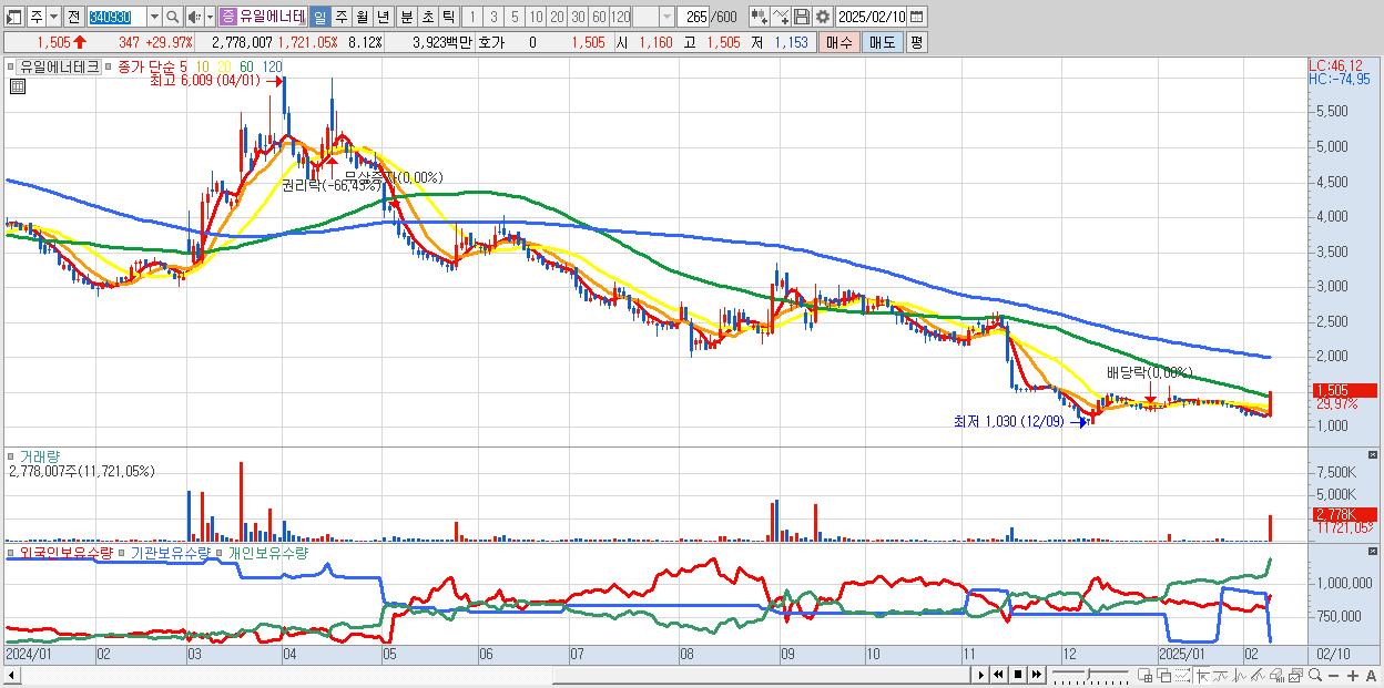 - 유일에너테크 (1,505원 ▲ 29.97% , 시총: 515억, 거래량: 2,778,007, 거래대금:39억)