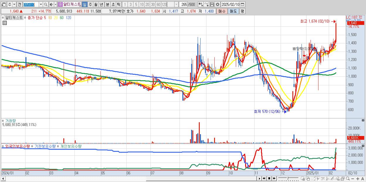 - 알티캐스트 (1,640원 ▲ 14.77% , 시총: 805억, 거래량: 5,680,913, 거래대금:80억)