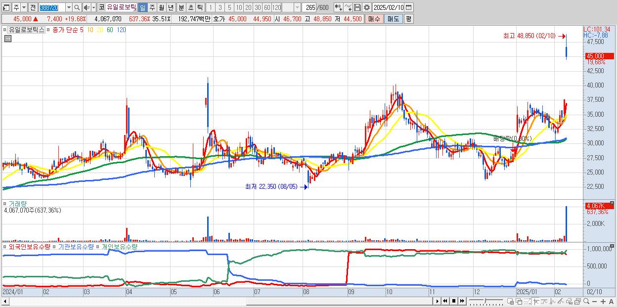 - 유일로보틱스 (45,000원 ▲ 19.68% , 시총: 5,154억, 거래량: 4,067,070, 거래대금:1,927억)