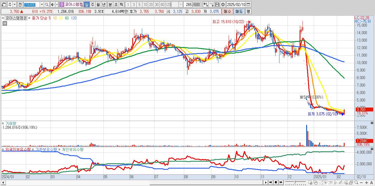 - 코아스템켐온 (3,760원 ▲ 19.37% , 시총: 1,236억, 거래량: 1,284,016, 거래대금:46억)
