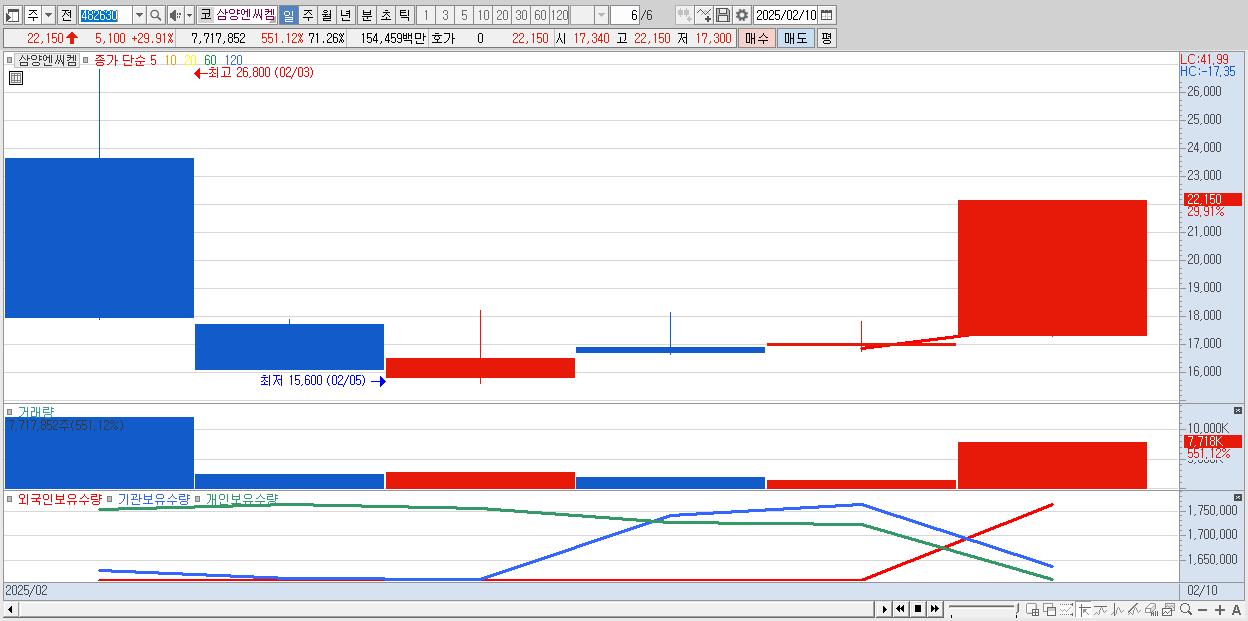 - 삼양엔씨켐 (22,150원 ▲ 29.91% , 시총: 2,399억, 거래량: 7,717,852, 거래대금:1,545억)