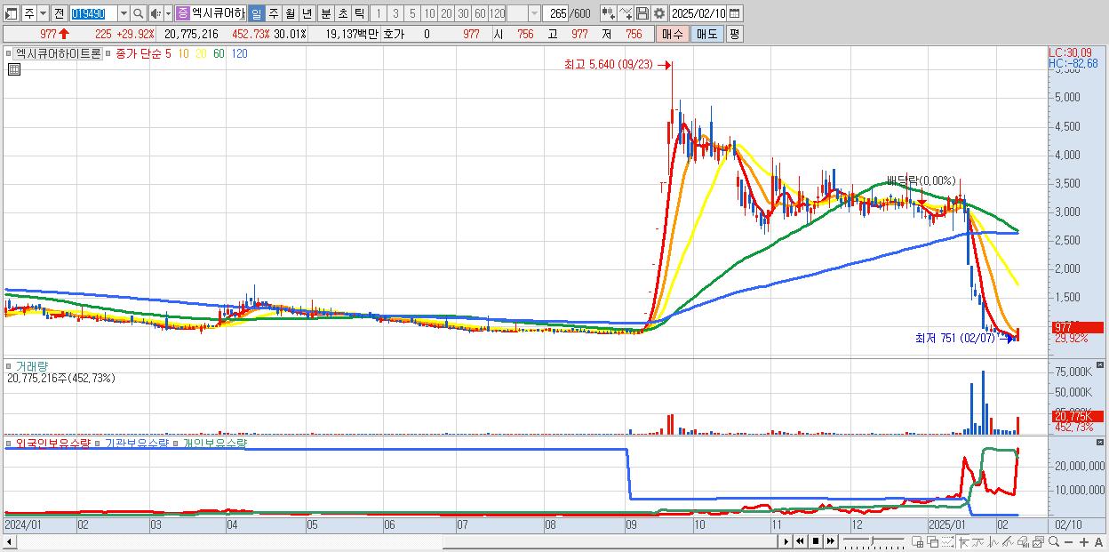 - 엑시큐어하이트론 (977원 ▲ 29.92% , 시총: 676억, 거래량: 20,775,216, 거래대금:191억)