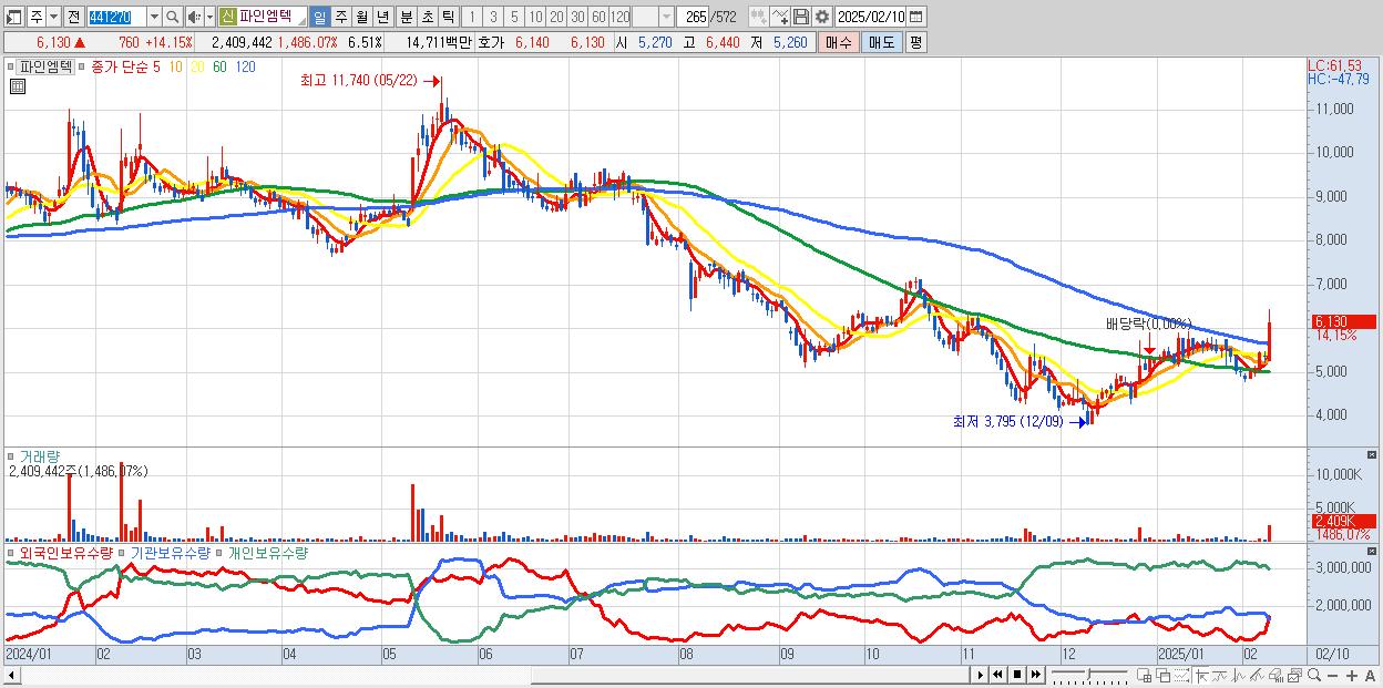 - 파인엠텍 (6,130원 ▲ 14.15% , 시총: 2,267억, 거래량: 2,409,442, 거래대금:147억)