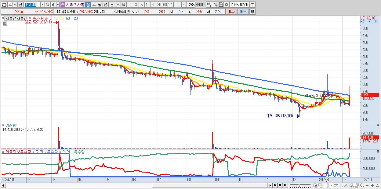- 서울전자통신 (263원 ▲ 15.86% , 시총: 183억, 거래량: 14,430,390, 거래대금:40억)