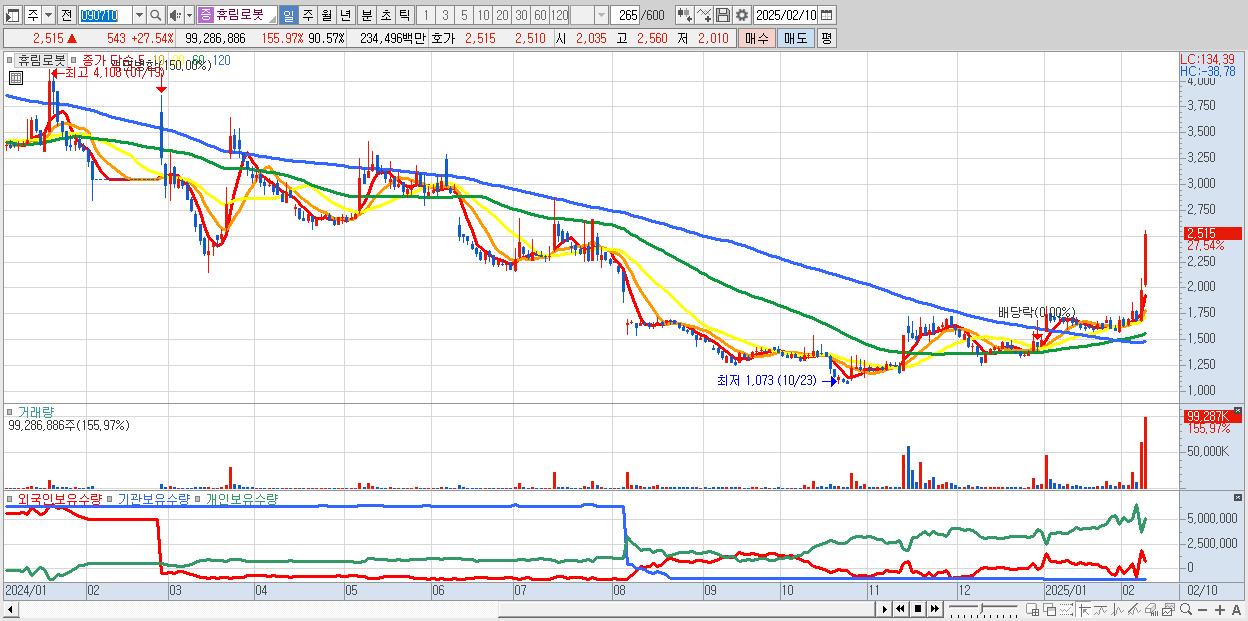 - 휴림로봇 (2,515원 ▲ 27.54% , 시총: 2,757억, 거래량: 99,286,886, 거래대금:2,345억)