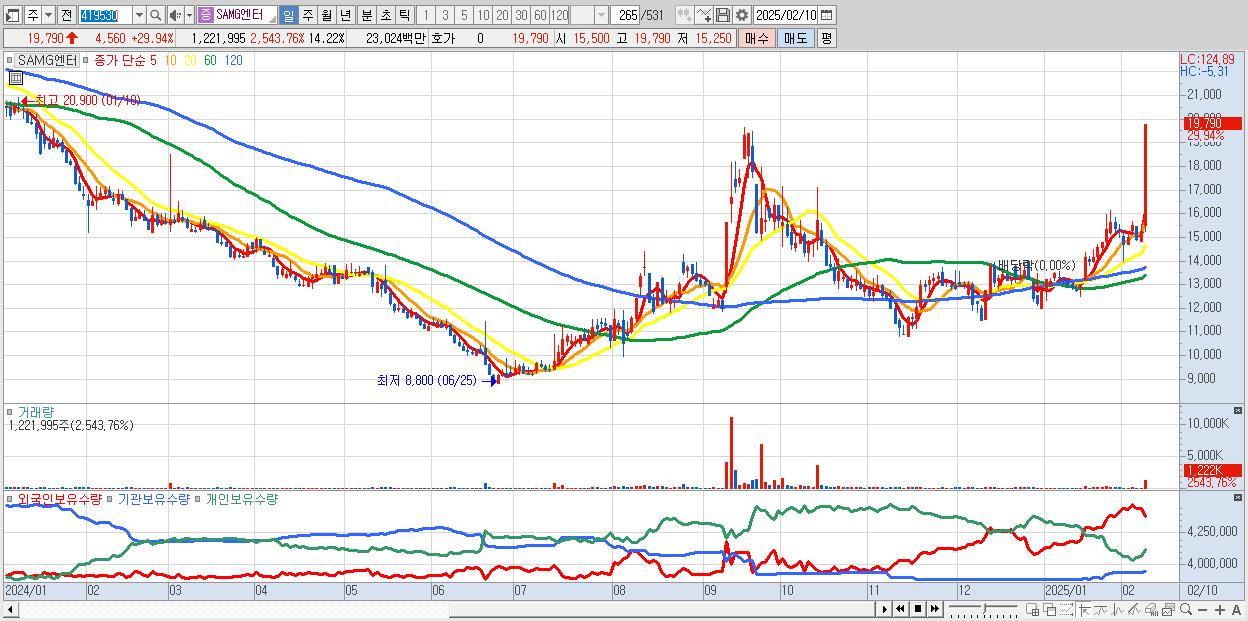 - SAMG엔터 (19,790원 ▲ 29.94% , 시총: 1,700억, 거래량: 1,221,995, 거래대금:230억)