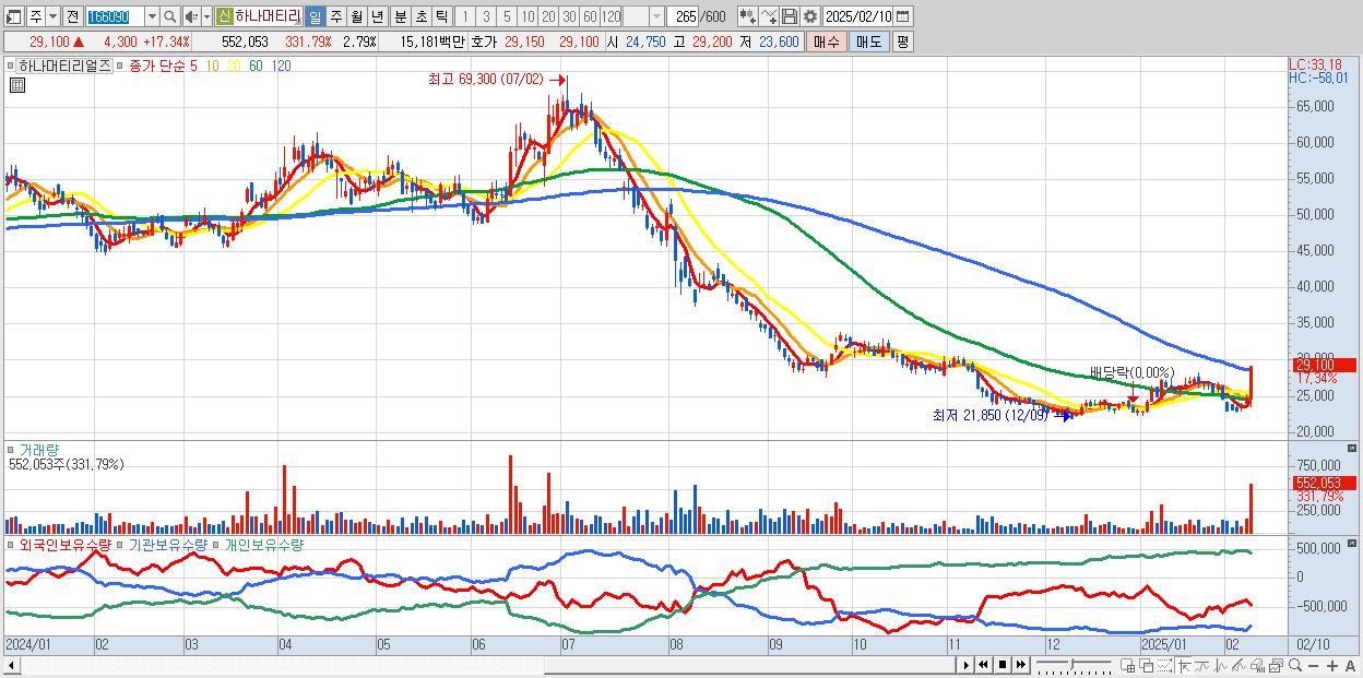 - 하나머티리얼즈 (29,100원 ▲ 17.34% , 시총: 5,755억, 거래량: 552,053, 거래대금:152억)