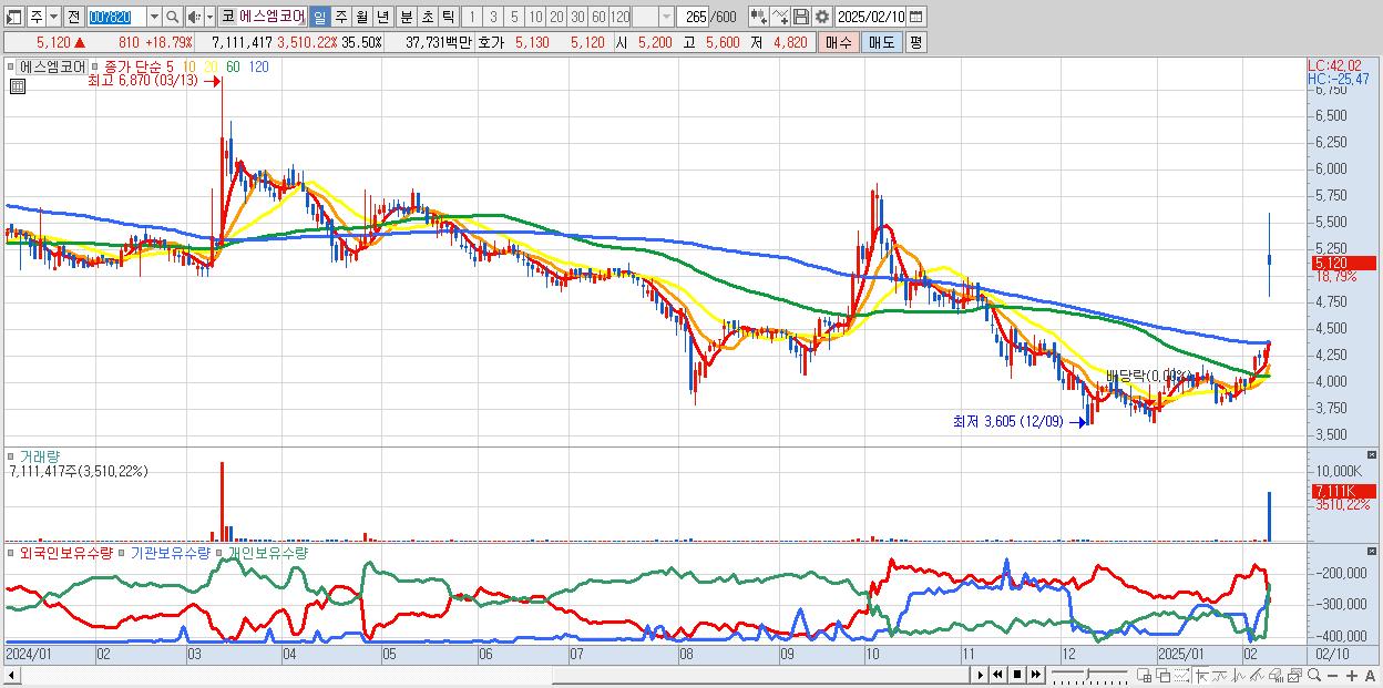 - 에스엠코어 (5,120원 ▲ 18.79% , 시총: 1,026억, 거래량: 7,111,417, 거래대금:377억)