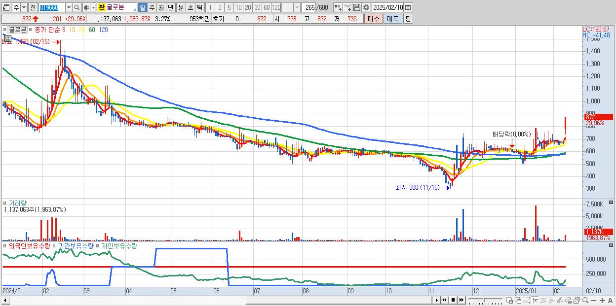 - 글로본 (872원 ▲ 29.96% , 시총: 303억, 거래량: 1,137,063, 거래대금:10억)