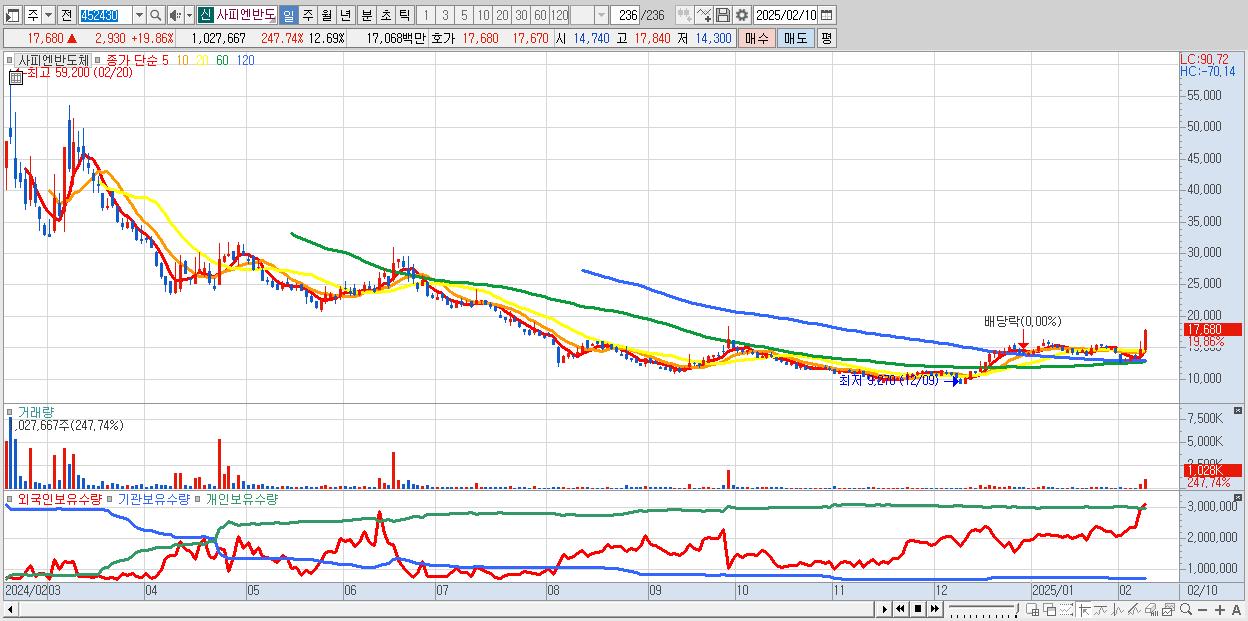 - 사피엔반도체 (17,680원 ▲ 19.86% , 시총: 1,431억, 거래량: 1,027,667, 거래대금:171억)