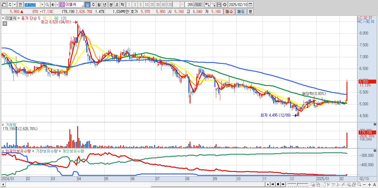 - 이엘씨 (5,950원 ▲ 17.13% , 시총: 725억, 거래량: 179,199, 거래대금:10억)